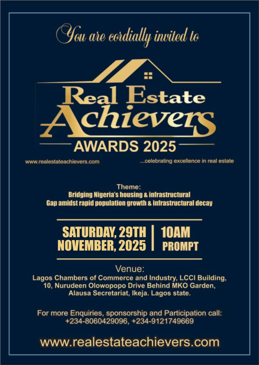 According to the convener of the Real Estate Achievers Awards and Exhibition 2025, Mr. Okpe Anthony Okpe who extends his unreserved apologies this postponement must have caused and assured all recipients and anticipated sponsors that the event would now take place on the 29th of November 2025 as announced